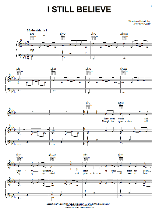Download or print Jeremy Camp I Still Believe sheet music, chords and digital score arranged for Easy Piano. This Christian score includes 6 page(s).