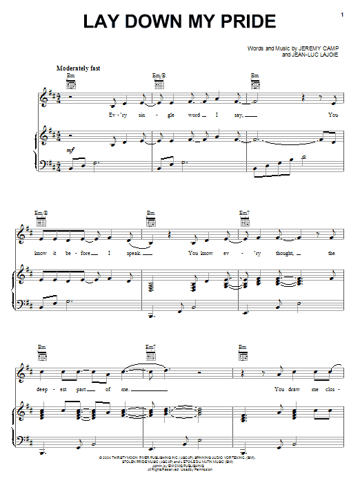 Download or print Jeremy Camp Lay Down My Pride sheet music, chords and digital score arranged for Piano, Vocal & Guitar Chords (Right-Hand Melody). This Christian score includes 9 page(s).