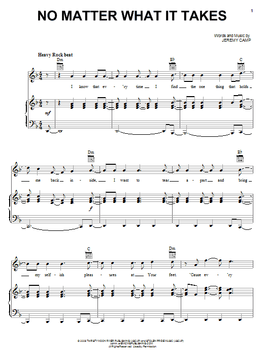 Download or print Jeremy Camp No Matter What It Takes sheet music, chords and digital score arranged for Piano, Vocal & Guitar Chords (Right-Hand Melody). This Christian score includes 8 page(s).