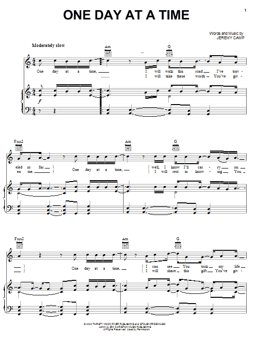 Download or print Jeremy Camp One Day At A Time sheet music, chords and digital score arranged for Piano, Vocal & Guitar Chords (Right-Hand Melody). This Christian score includes 6 page(s).