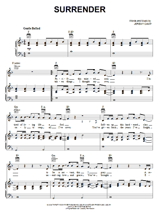 Download or print Jeremy Camp Surrender sheet music, chords and digital score arranged for Piano, Vocal & Guitar Chords (Right-Hand Melody). This Christian score includes 4 page(s).