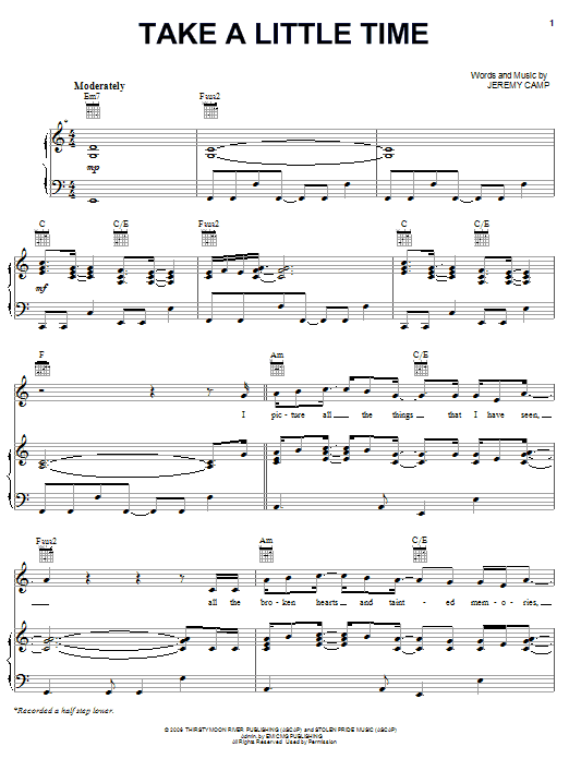 Download or print Jeremy Camp Take A Little Time sheet music, chords and digital score arranged for Piano, Vocal & Guitar Chords (Right-Hand Melody). This Christian score includes 8 page(s).