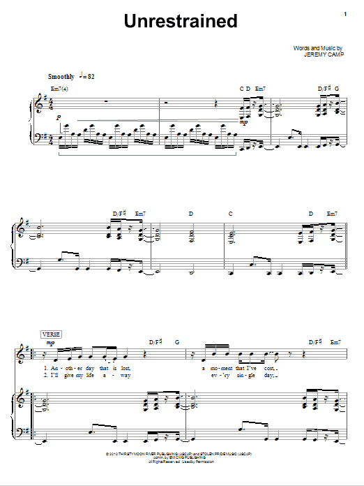 Download or print Jeremy Camp Unrestrained sheet music, chords and digital score arranged for Piano, Vocal & Guitar Chords (Right-Hand Melody). This Christian score includes 5 page(s).
