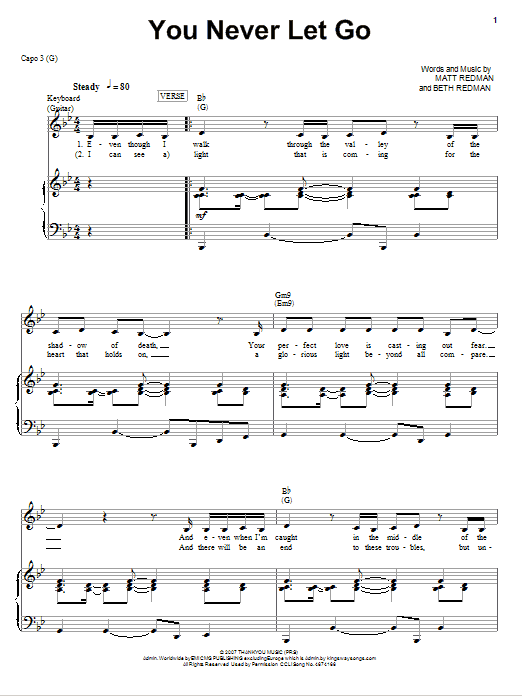 Download or print Jeremy Camp You Never Let Go sheet music, chords and digital score arranged for Piano, Vocal & Guitar Chords (Right-Hand Melody). This Christian score includes 7 page(s).