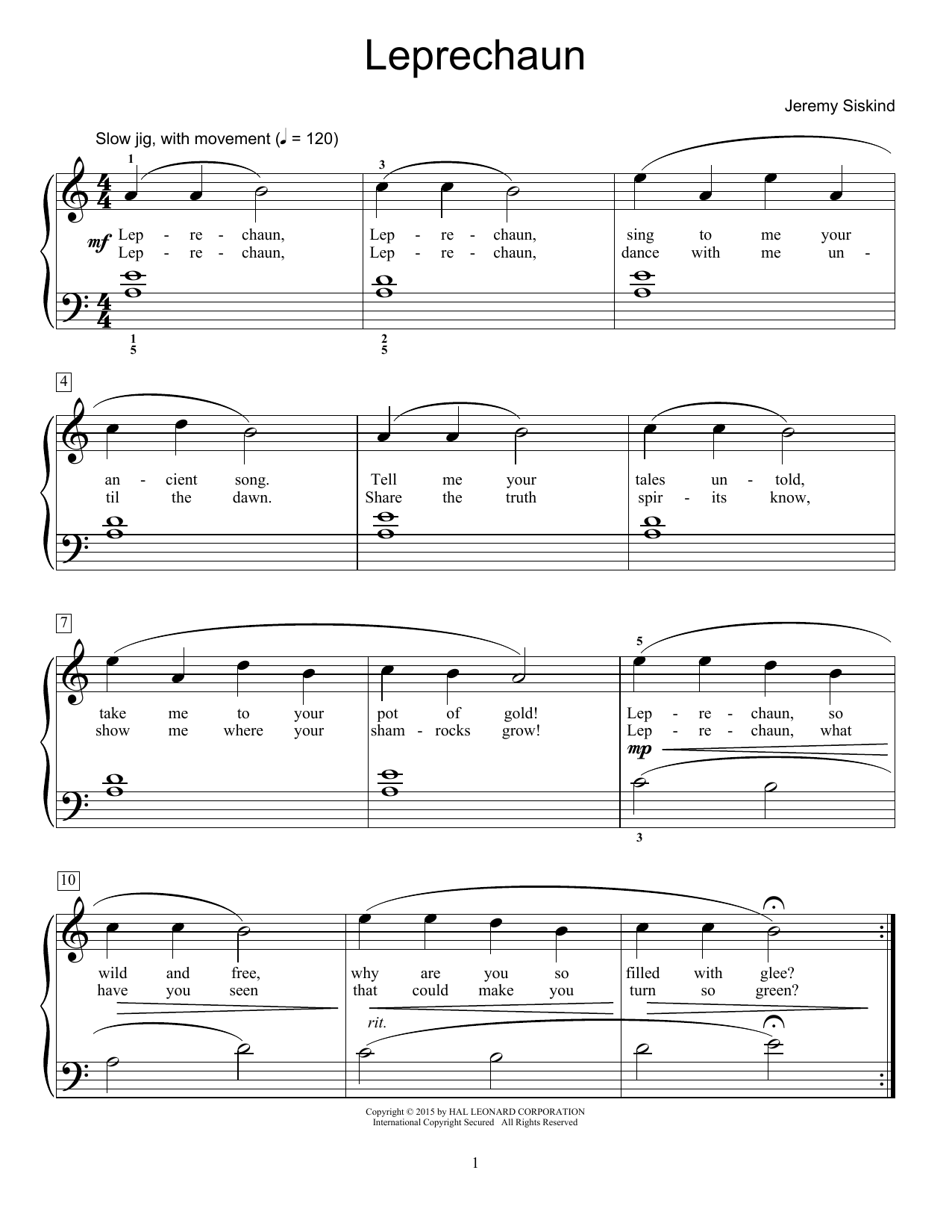 Download or print Jeremy Siskind Leprechaun sheet music, chords and digital score arranged for Educational Piano. This Children score includes 2 page(s).