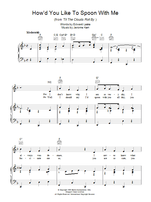 Download or print Jerome Kern How'd You Like To Spoon With Me sheet music, chords and digital score arranged for Piano, Vocal & Guitar Chords. This Standards score includes 4 page(s).