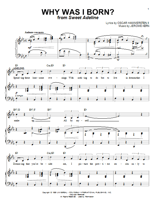 Download or print Jerome Kern Why Was I Born? sheet music, chords and digital score arranged for Piano, Vocal & Guitar Chords (Right-Hand Melody). This Musical/Show score includes 4 page(s).