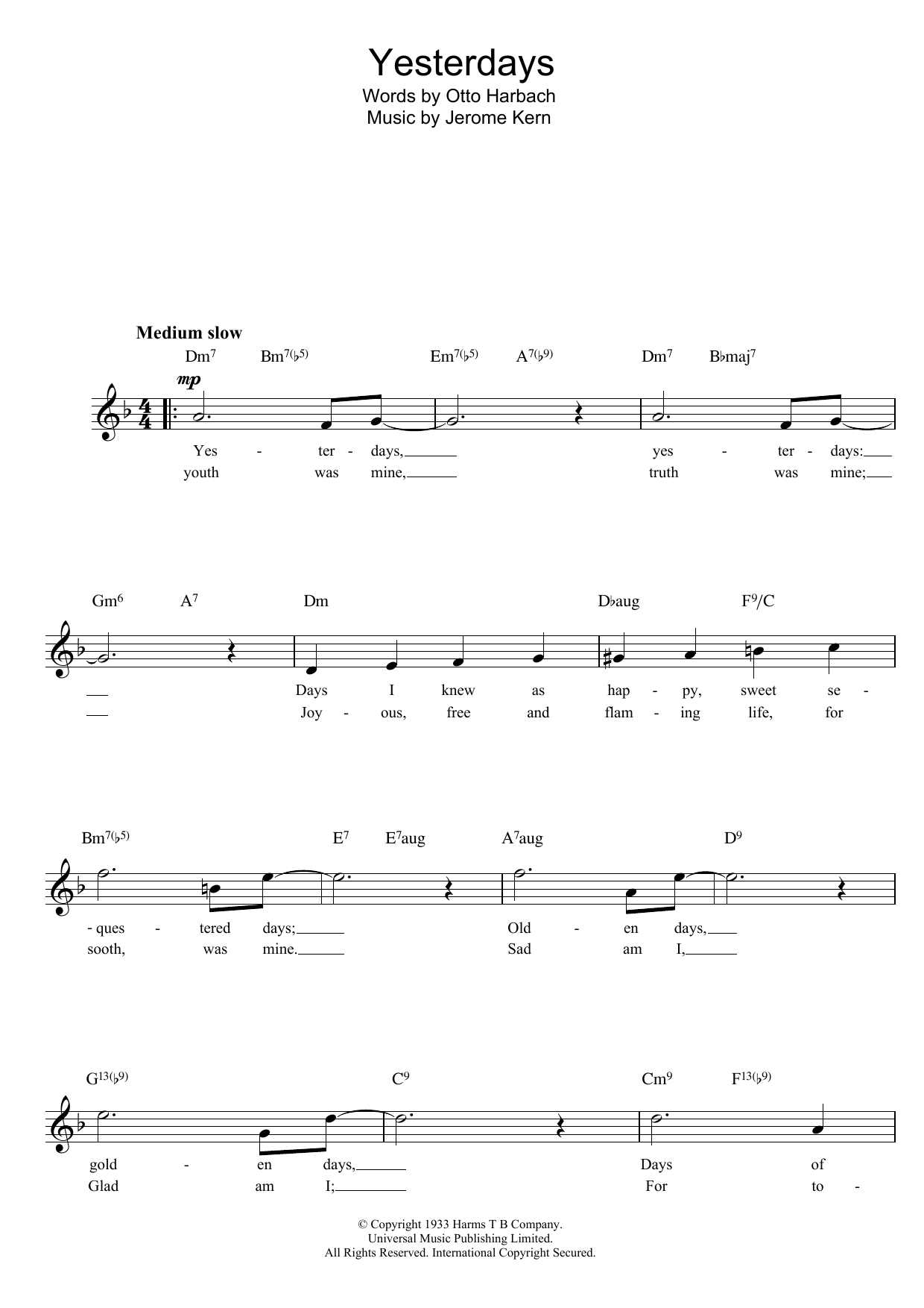 Download or print Jerome Kern Yesterdays sheet music, chords and digital score arranged for Easy Piano. This Jazz score includes 2 page(s).