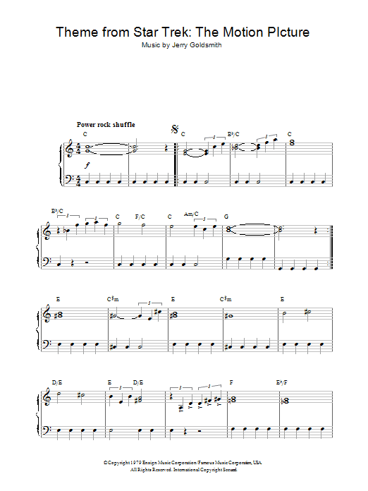 Download or print Jerry Goldsmith Theme from Star Trek: The Motion Picture sheet music, chords and digital score arranged for Piano Solo. This Film/TV score includes 2 page(s).