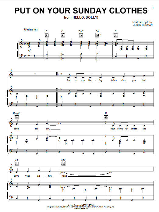 Download or print Jerry Herman Put On Your Sunday Clothes sheet music, chords and digital score arranged for Piano, Vocal & Guitar Chords (Right-Hand Melody). This Musical/Show score includes 4 page(s).
