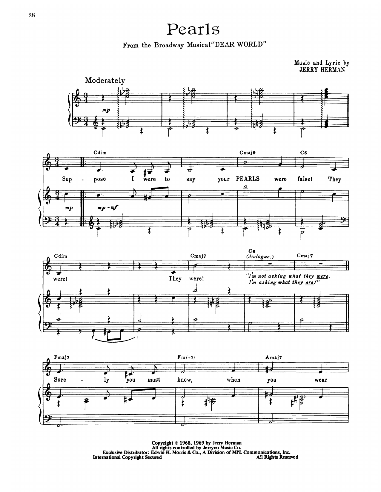 Download or print Jerry Herman The Pearls (from Dear World) sheet music, chords and digital score arranged for Piano, Vocal & Guitar Chords (Right-Hand Melody). This Blues score includes 2 page(s).