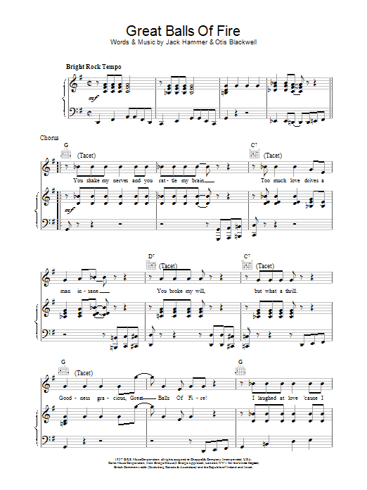 Download or print Jerry Lee Lewis Great Balls Of Fire sheet music, chords and digital score arranged for Piano, Vocal & Guitar Chords (Right-Hand Melody). This Oldies score includes 4 page(s).