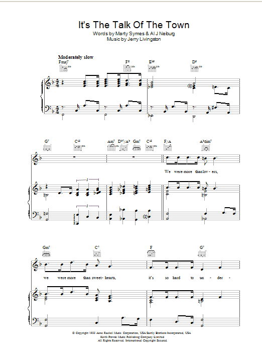 Download or print Jerry Livingston It's The Talk Of The Town sheet music, chords and digital score arranged for Real Book – Melody & Chords – C Instruments. This Jazz score includes 1 page(s).