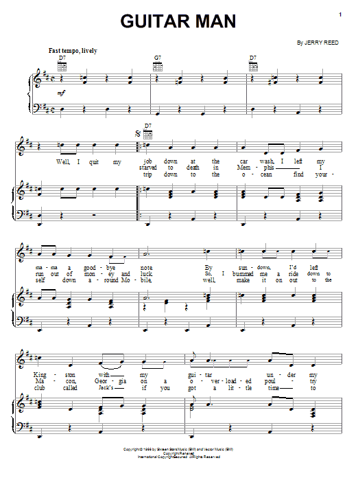Download or print Jerry Reed Guitar Man sheet music, chords and digital score arranged for Piano, Vocal & Guitar Chords (Right-Hand Melody). This Country score includes 5 page(s).