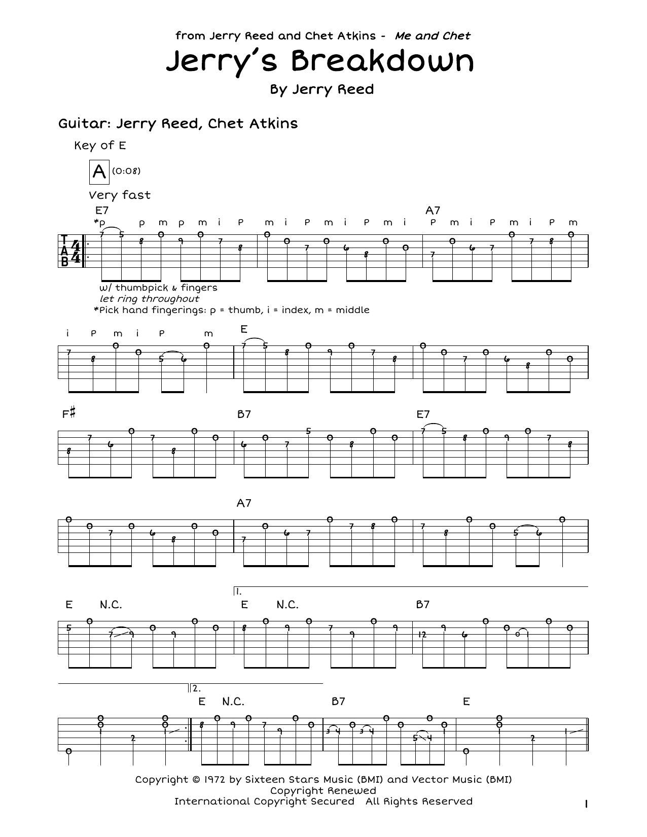 Download or print Jerry Reed Jerry's Breakdown sheet music, chords and digital score arranged for Solo Guitar. This Country score includes 7 page(s).