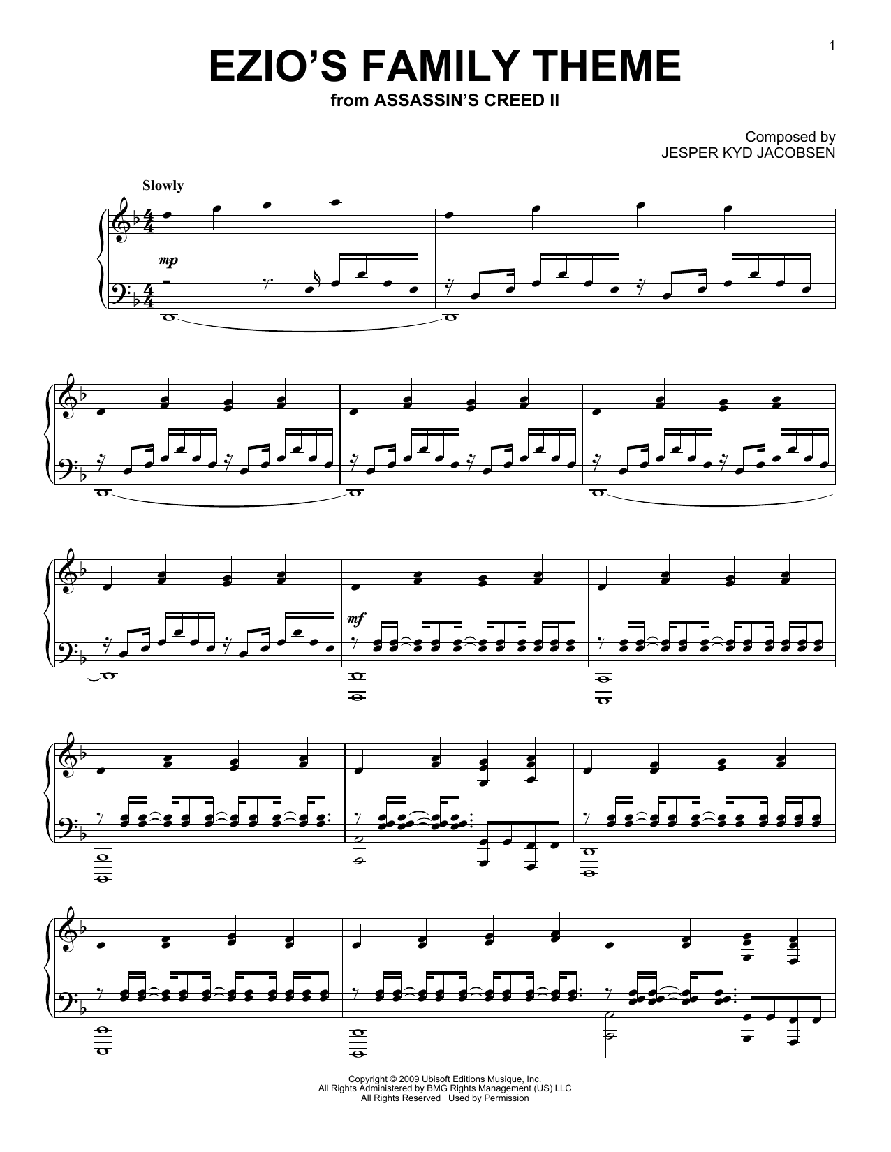 Download or print Jesper Kyd Jacobsen Ezio's Family (from Assassin's Creed II) sheet music, chords and digital score arranged for Easy Piano Solo. This Video Game score includes 3 page(s).