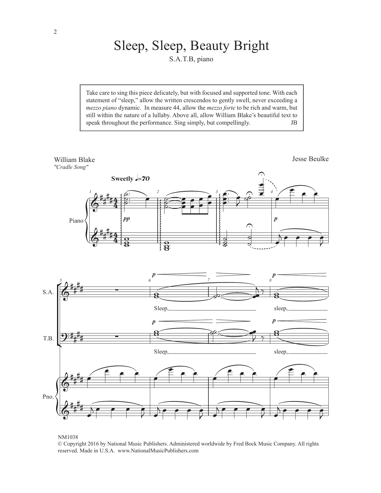 Download or print Jesse Beulke Sleep, Sleep Beauty Bright sheet music, chords and digital score arranged for SATB Choir. This Poetry score includes 7 page(s).
