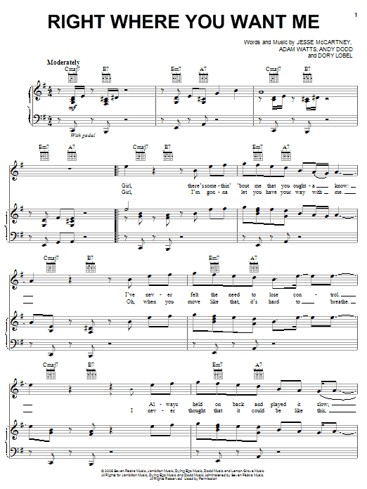 Download or print Jesse McCartney Right Where You Want Me sheet music, chords and digital score arranged for Piano, Vocal & Guitar Chords (Right-Hand Melody). This Pop score includes 5 page(s).