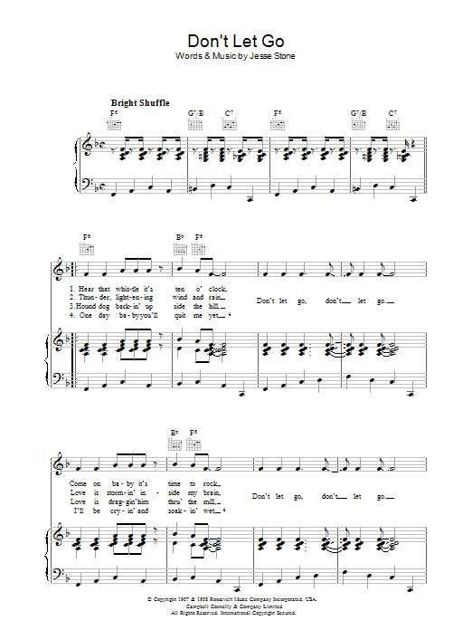 Download or print Jesse Stone Don't Let Go sheet music, chords and digital score arranged for Piano, Vocal & Guitar Chords. This Pop score includes 3 page(s).