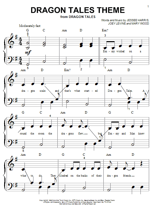 Download or print Jessee Harris Dragon Tales Theme sheet music, chords and digital score arranged for Piano, Vocal & Guitar Chords (Right-Hand Melody). This Children score includes 4 page(s).