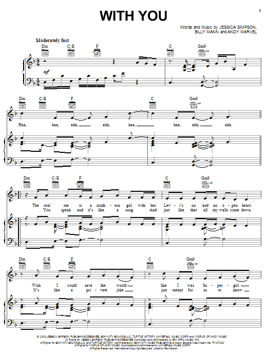 Download or print Jessica Simpson With You sheet music, chords and digital score arranged for Piano, Vocal & Guitar Chords (Right-Hand Melody). This Pop score includes 5 page(s).