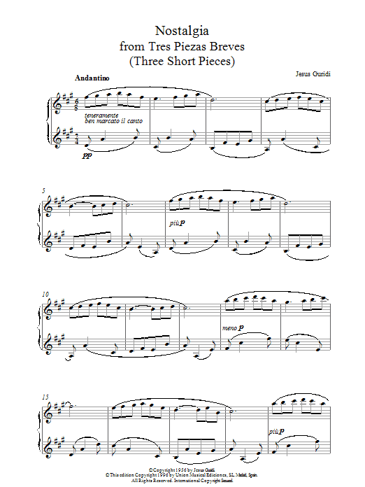 Download or print Jesus Guridi Nostalgia From Tres Piezas Breves sheet music, chords and digital score arranged for Piano Solo. This Classical score includes 3 page(s).