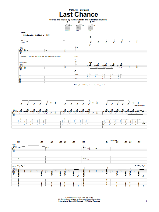 Download or print Jet Last Chance sheet music, chords and digital score arranged for Guitar Tab. This Rock score includes 4 page(s).