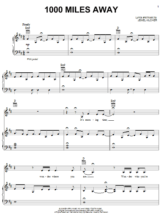 Download or print Jewel 1000 Miles Away sheet music, chords and digital score arranged for Piano, Vocal & Guitar Chords (Right-Hand Melody). This Folk score includes 8 page(s).