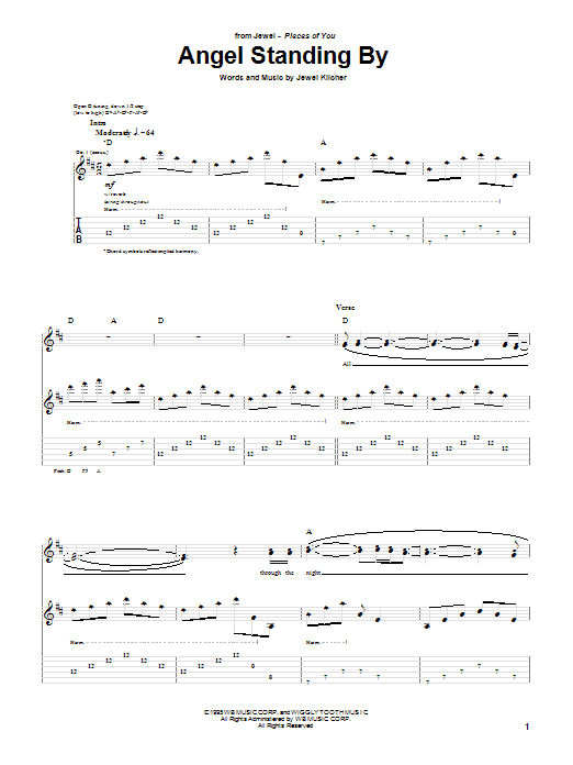 Download or print Jewel Angel Standing By sheet music, chords and digital score arranged for Guitar Tab. This Folk score includes 5 page(s).