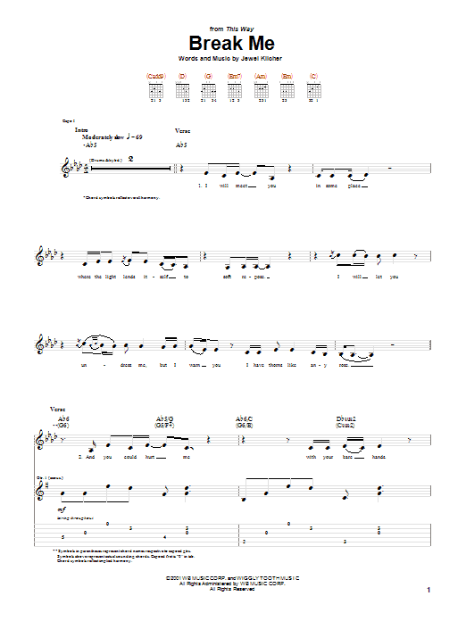 Download or print Jewel Break Me sheet music, chords and digital score arranged for Guitar Tab. This Folk score includes 8 page(s).