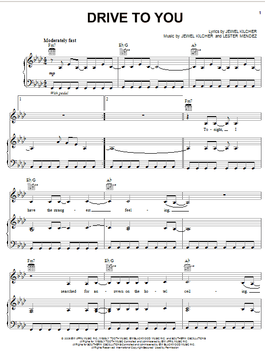 Download or print Jewel Drive To You sheet music, chords and digital score arranged for Piano, Vocal & Guitar Chords (Right-Hand Melody). This Pop score includes 7 page(s).
