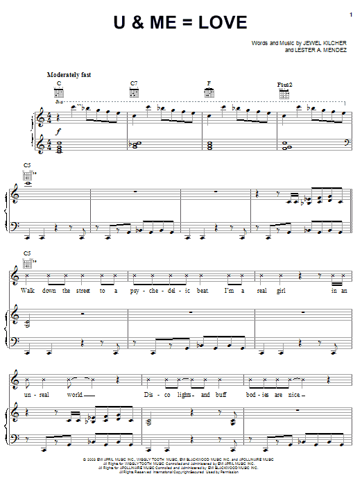 Download or print Jewel U & Me=Love sheet music, chords and digital score arranged for Piano, Vocal & Guitar Chords (Right-Hand Melody). This Pop score includes 6 page(s).