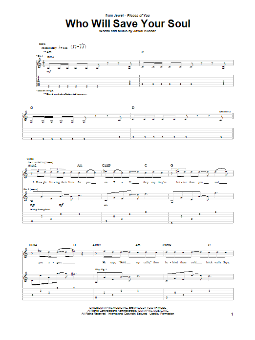 Download or print Jewel Who Will Save Your Soul sheet music, chords and digital score arranged for Guitar Chords/Lyrics. This Rock score includes 3 page(s).