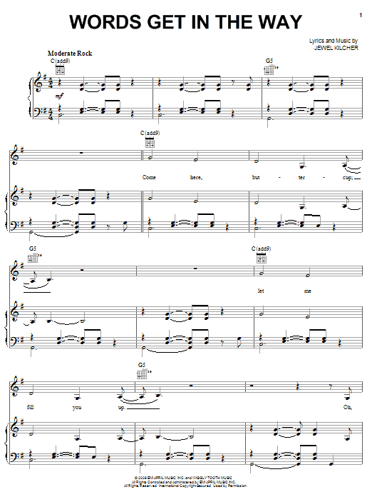 Download or print Jewel Words Get In The Way sheet music, chords and digital score arranged for Piano, Vocal & Guitar Chords (Right-Hand Melody). This Country score includes 7 page(s).