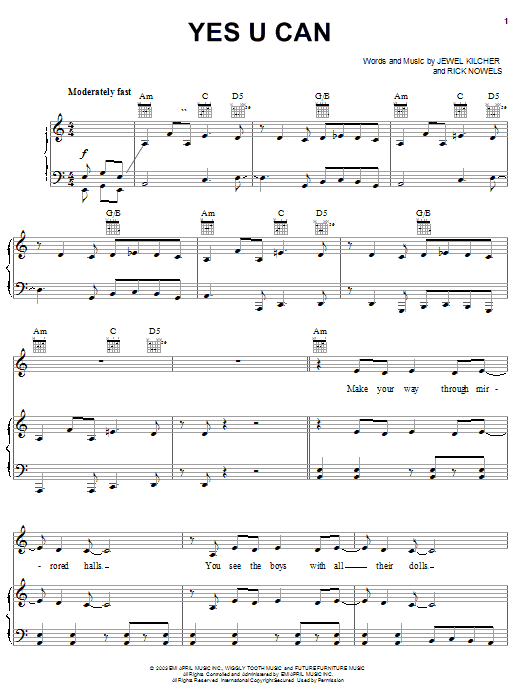 Download or print Jewel Yes U Can sheet music, chords and digital score arranged for Piano, Vocal & Guitar Chords (Right-Hand Melody). This Pop score includes 7 page(s).