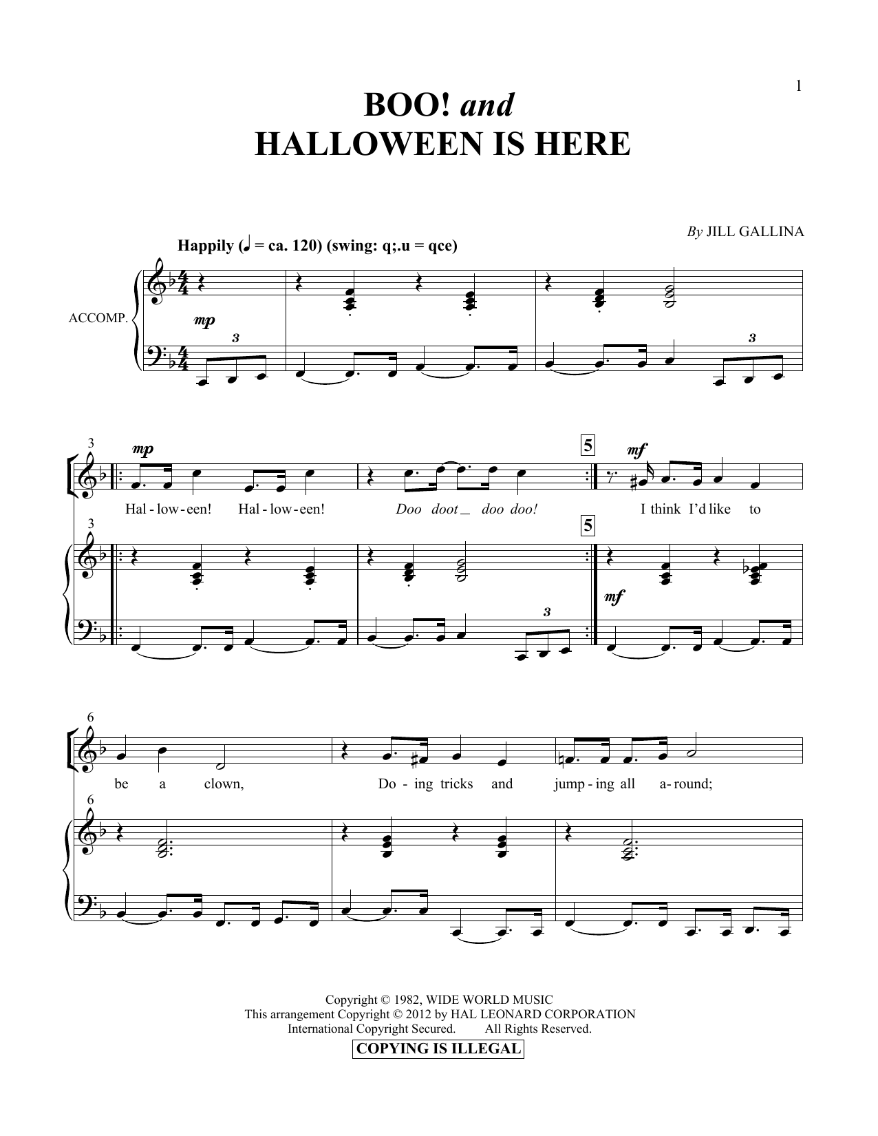 Download or print Jill Gallina Boo! & Halloween Is Here sheet music, chords and digital score arranged for Vocal Duet. This Holiday score includes 5 page(s).