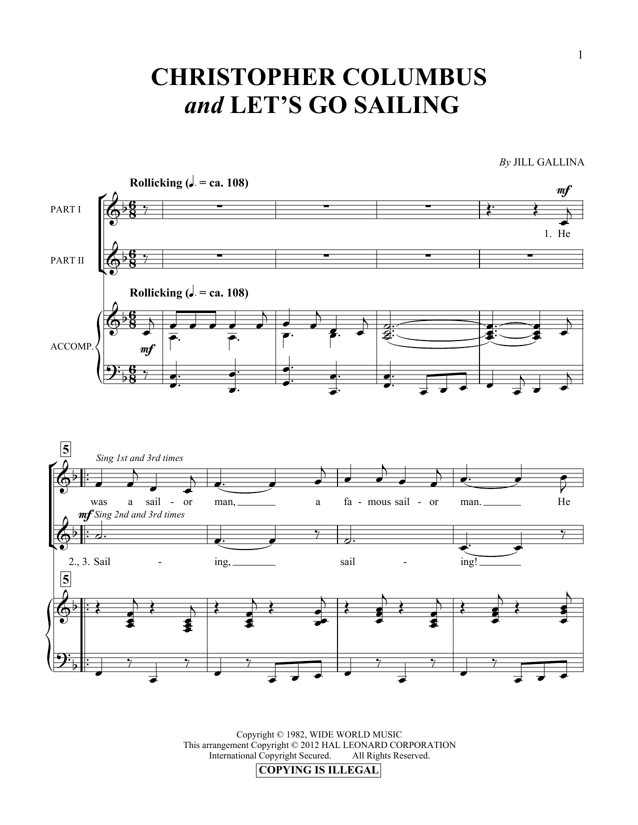 Download or print Jill Gallina Christopher Columbus & Let's Go Sailing sheet music, chords and digital score arranged for Vocal Duet. This Holiday score includes 4 page(s).