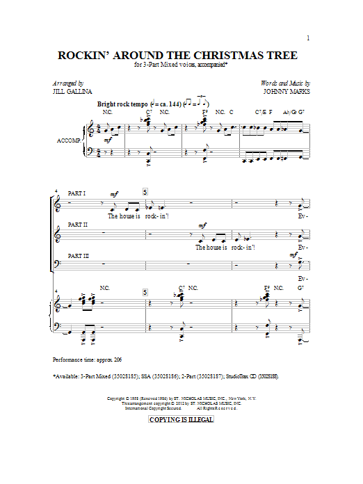 Download or print Jill Gallina Rockin' Around The Christmas Tree (arr. Jill Gallina) sheet music, chords and digital score arranged for 3-Part Mixed Choir. This Christmas score includes 11 page(s).