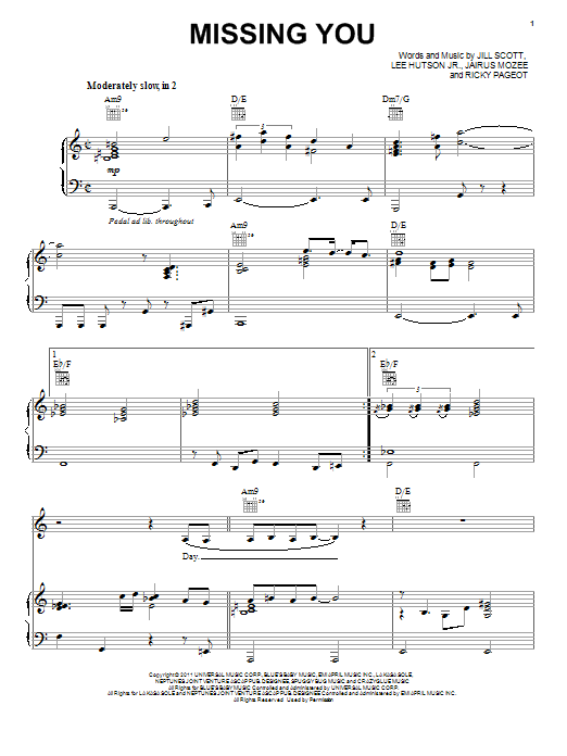 Download or print Jill Scott Missing You sheet music, chords and digital score arranged for Piano, Vocal & Guitar Chords (Right-Hand Melody). This Pop score includes 7 page(s).
