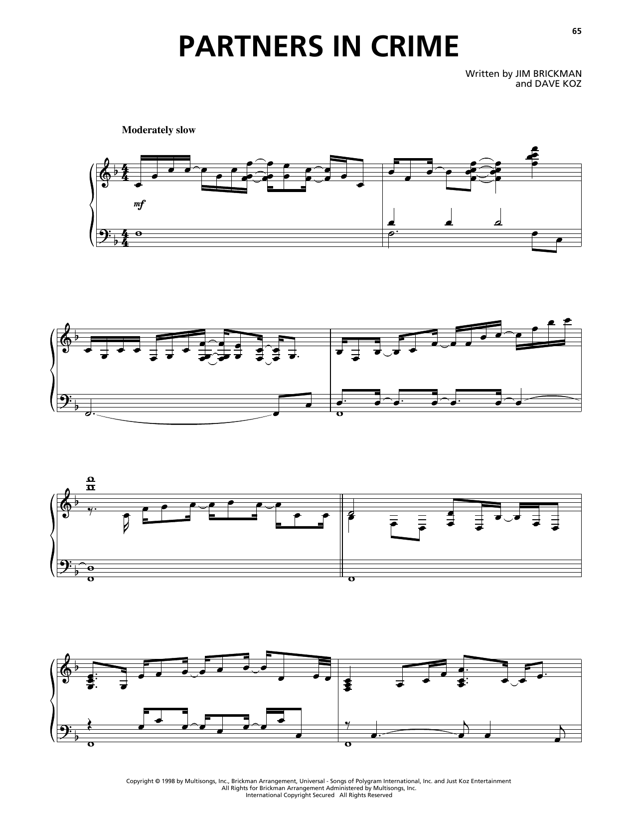 Download or print Jim Brickman Partners In Crime sheet music, chords and digital score arranged for Piano Solo. This Pop score includes 6 page(s).