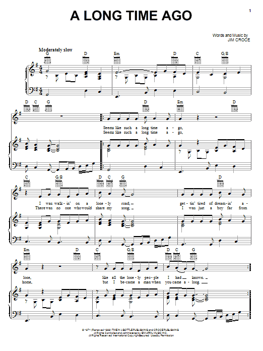 Download or print Jim Croce A Long Time Ago sheet music, chords and digital score arranged for Guitar Chords/Lyrics. This Pop score includes 2 page(s).