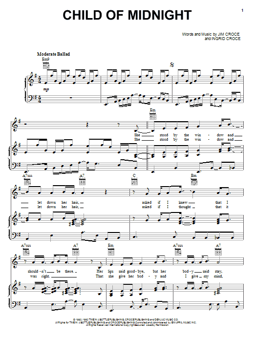 Download or print Jim Croce Child Of Midnight sheet music, chords and digital score arranged for Piano, Vocal & Guitar Chords (Right-Hand Melody). This Folk score includes 5 page(s).