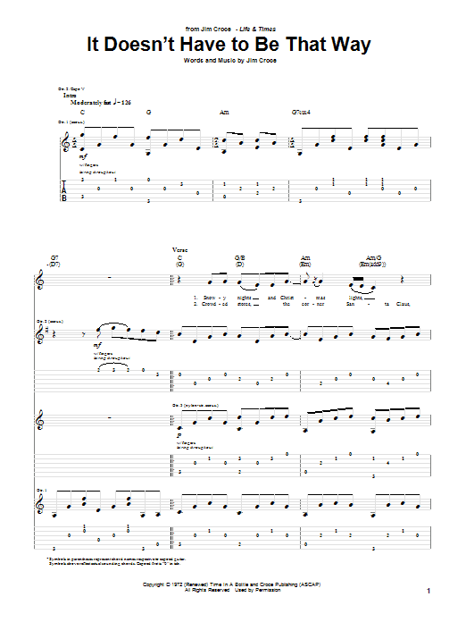 Download or print Jim Croce It Doesn't Have To Be That Way sheet music, chords and digital score arranged for Piano, Vocal & Guitar Chords (Right-Hand Melody). This Folk score includes 4 page(s).