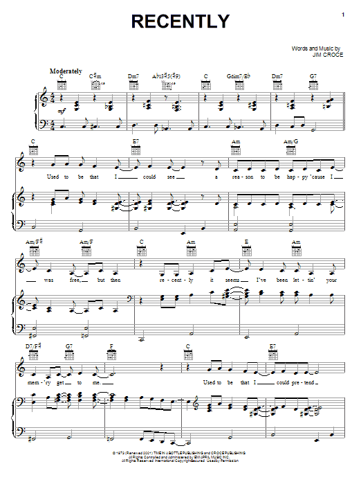 Download or print Jim Croce Recently sheet music, chords and digital score arranged for Guitar Chords/Lyrics. This Folk score includes 2 page(s).