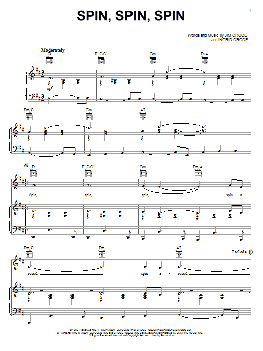 Download or print Jim Croce Spin, Spin, Spin sheet music, chords and digital score arranged for Piano, Vocal & Guitar Chords (Right-Hand Melody). This Folk score includes 4 page(s).