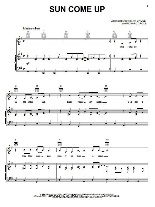 Download or print Jim Croce Sun Come Up sheet music, chords and digital score arranged for Piano, Vocal & Guitar Chords (Right-Hand Melody). This Folk score includes 4 page(s).