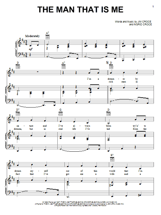 Download or print Jim Croce The Man That Is Me sheet music, chords and digital score arranged for Piano, Vocal & Guitar Chords (Right-Hand Melody). This Folk score includes 6 page(s).
