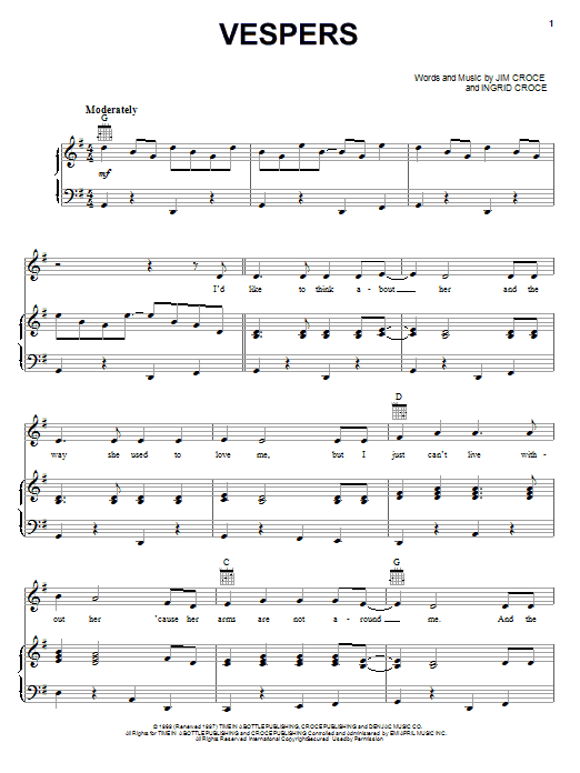 Download or print Jim Croce Vespers sheet music, chords and digital score arranged for Guitar Chords/Lyrics. This Folk score includes 2 page(s).