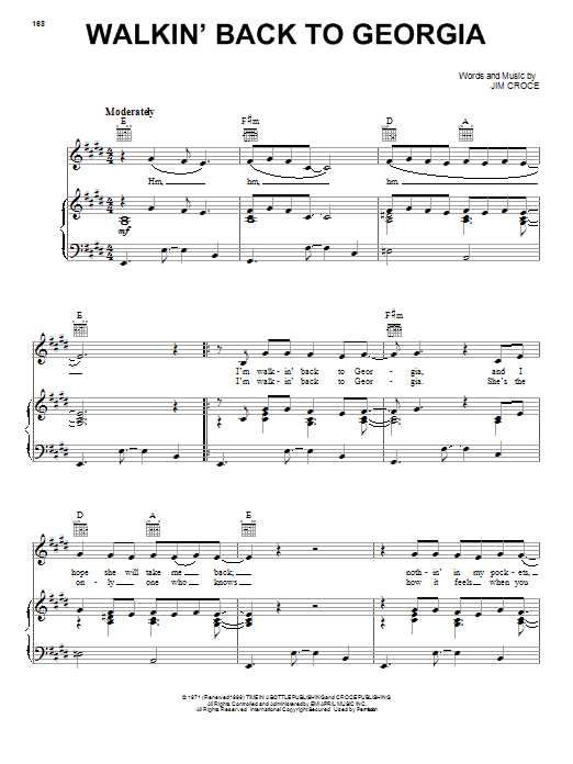 Download or print Jim Croce Walkin' Back To Georgia sheet music, chords and digital score arranged for Piano, Vocal & Guitar Chords (Right-Hand Melody). This Folk score includes 3 page(s).