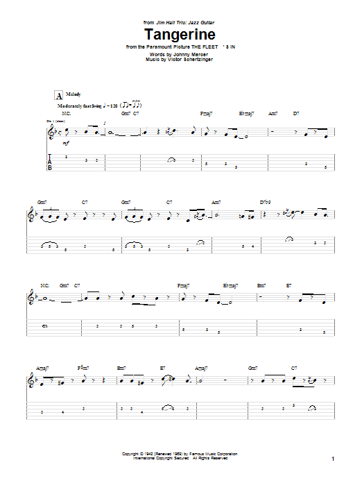 Download or print Jim Hall Tangerine sheet music, chords and digital score arranged for Guitar Tab. This Blues score includes 6 page(s).